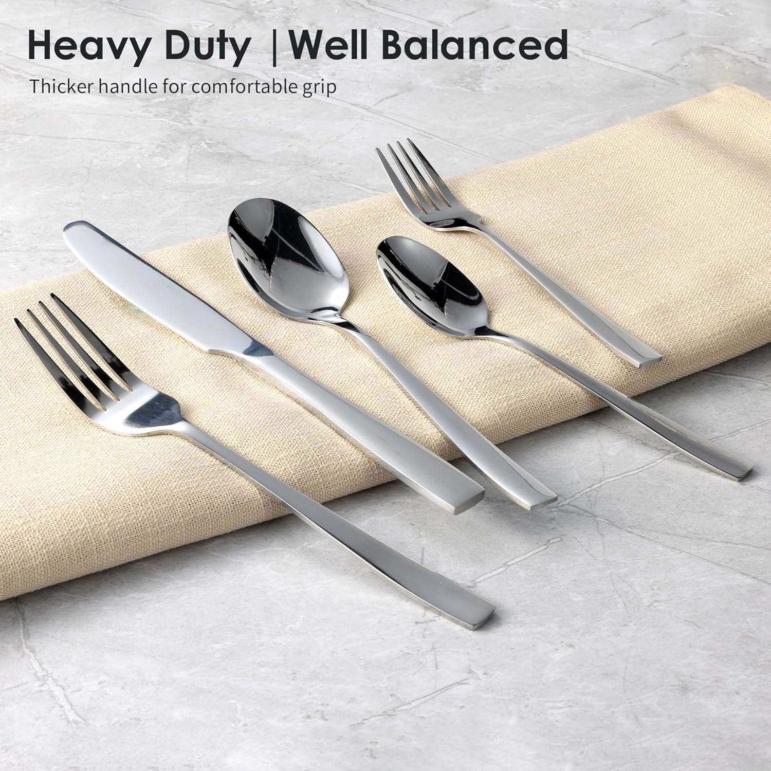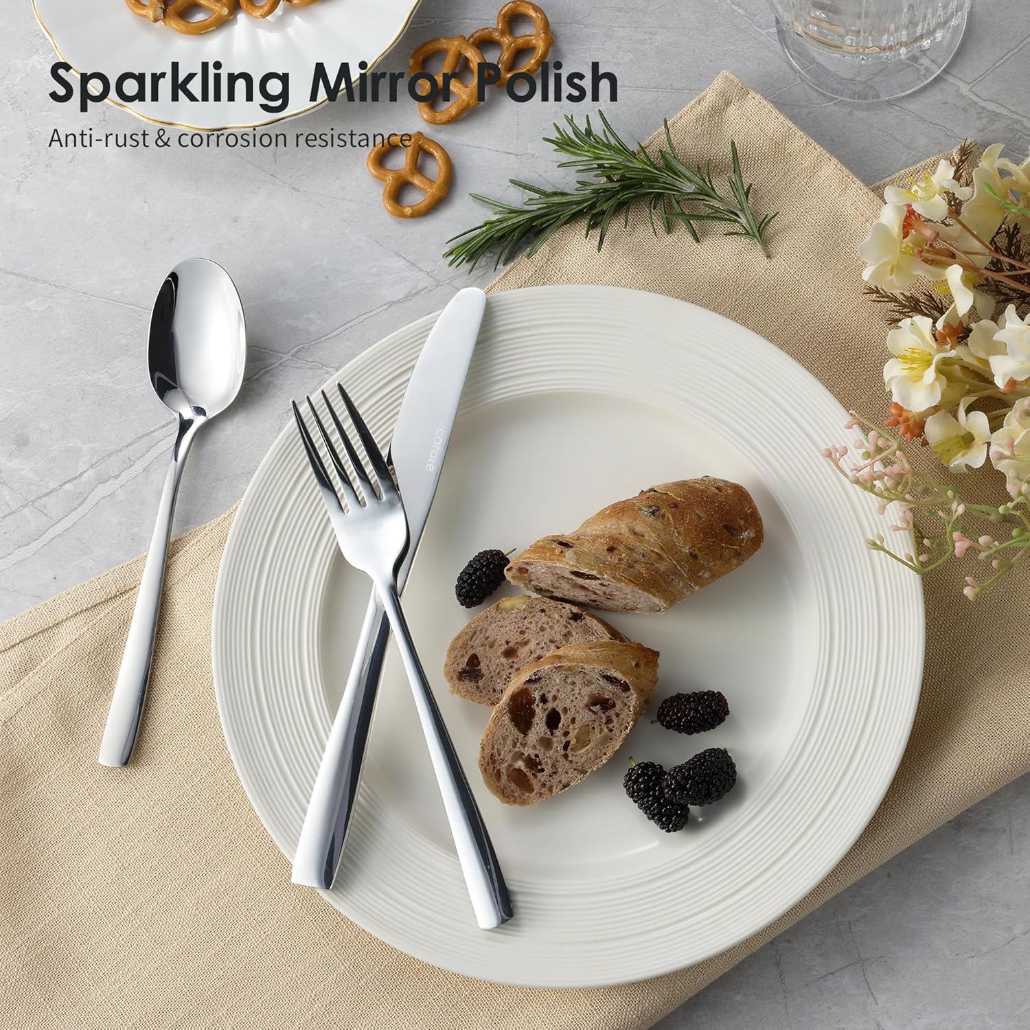 - Elegant Design & Balanced Handles: The highly mirror-polished finish and smooth edges give this flatware set a sophisticated look. Ergonomically designed handles provide a comfortable grip for both adults and kids, while the balanced weight makes every piece easy to use.